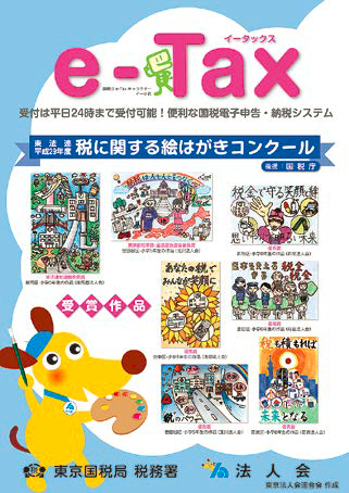 東法連では、昨年度に引き続き、e-Tax利用促進のため、イータ君と東法連絵はがきコンクール入賞作品を題材にしたポスターを作成した。ポスターには「法人会」及び「東京国税局 税務署」のロゴが付されている。今回は背景を青と白色とし、デザインを一新した。