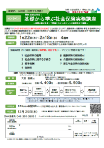 オンライン 基礎から学ぶ社会保険実務講座 日 時 令和8年1月22日(木)~2月18日(水)4週間 時 間 期間内、24時間・何度でも視聴! 会 場 WEBでの動画配信による講座になります。 受講料 会員:4,400円 受講料 一般:5,500円 申込期日 令和7年12月25日(金) ☜詳しくは画像をクリック