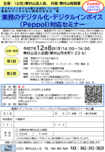 業務のデジタル化・デジタルインボイス(Peppol)対応セミナー 日 時 令和7年12月8日 第1部 業務のデジタル化の進め方 14:00~15:00 第2部 デジタルインボイスの基礎的知識 15:00~16:00 会 場 東村山法人会またZOOM 定 員 30名 参加費 無料 申込期限 12月4日(木)まで ☜詳しくは画像をクリック