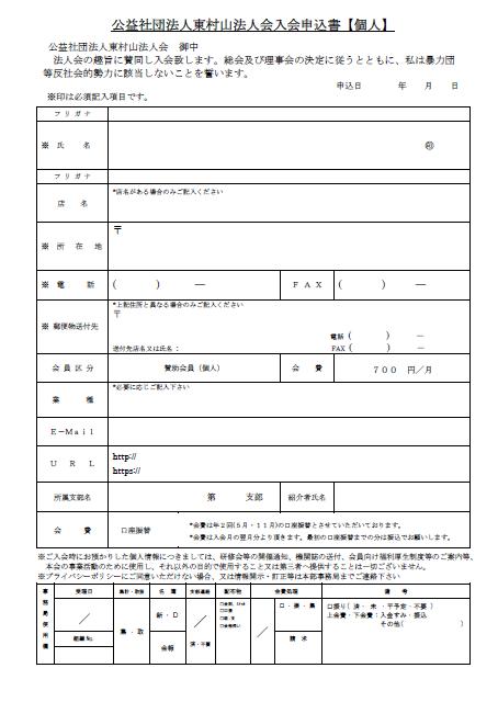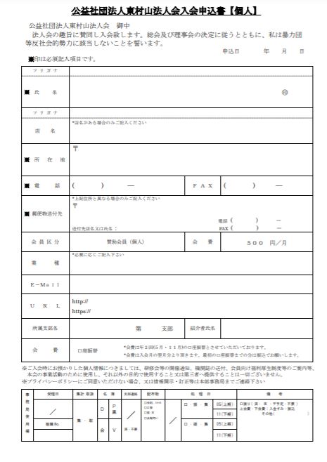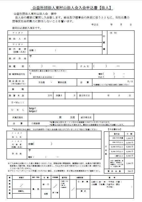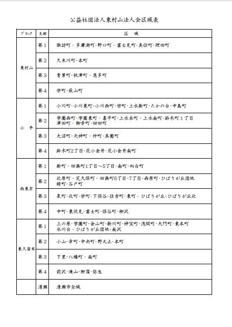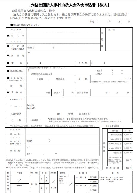 ■入会及び退会規定 ■入会申込書(法人) ■入会申込書(個人) ■会費規定 ■東村山法人会区域表 お問合せはこちらまで 公益社団法人 東村山法人会 〒189-0014 東村山市本町1-23-6 電 話 042-394-7654 FAX 042-392-3820