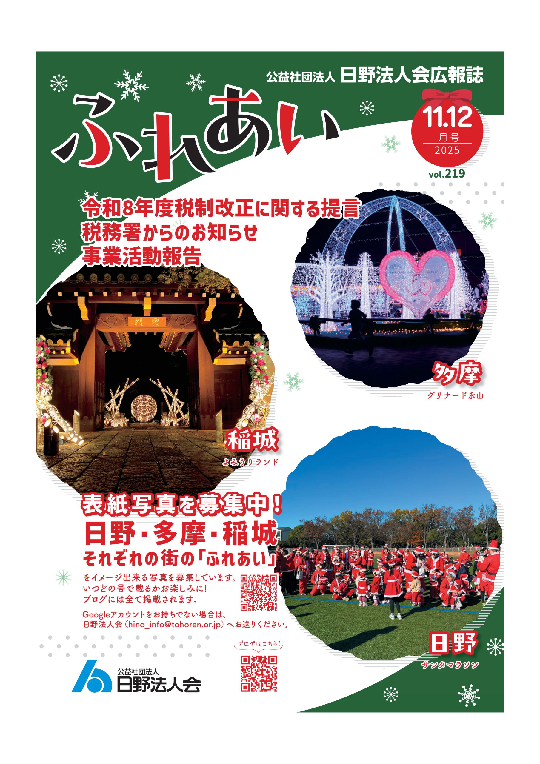 2025年 11-12月号 219号 本号(219号)から事業活動報告のQRコードをPCでクリックまたはスマホ・タブレットでQRコード画面をタップすると動画等が掲載されている「ブログ」へジャンプします。 2025年 9-10月号 218号 2025年 7-8月号 217号 2025年 5-6月号 216号 2025年 3-4月号 215号 2025年 1-2月号 214号 2024年 11ー12月号 213号 2024年 9-10月号 212号 2024年 7-8月号 211号 2024年 5‐6月号 210号 2024年 3‐4月号 209号 2024年 1-2月号 208号 2023年 11ー12月号 207号 2023年 9-10月号 206号 2023年 7-8月号 205号 2023年 5‐6月号 204号 2023年 3‐4月号 203号 2023年 1-2月号 202号 2022年 11-12月号 201号 2022年 9-10月号 200号 2022年 7-8月号 199号 2022年 5-6月号 198号 2022年 3-4月号 197号 2022年 1-2月号 196号 2021年 11-12月号 195号 2021年9-10月号 194号 2021年7-8月号 193号 2021年5-6月号 192号 2021年3-4月号 191号 2021年1-2月号 190号 1 2 … 4 次へ →