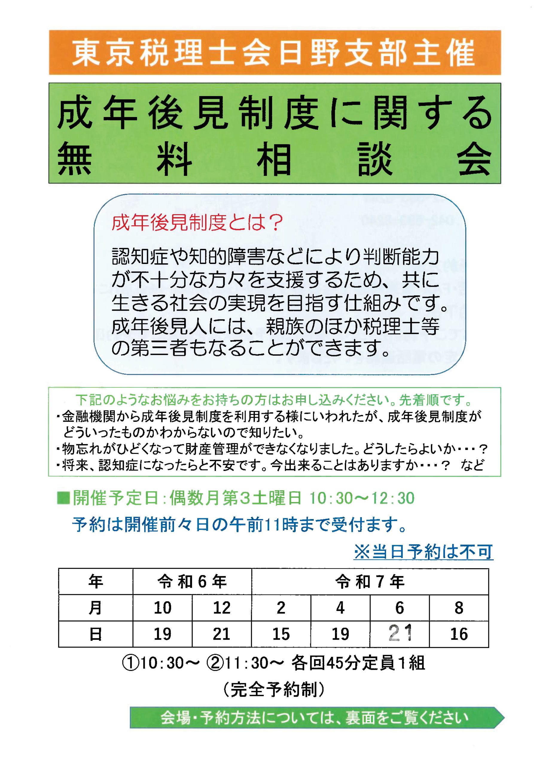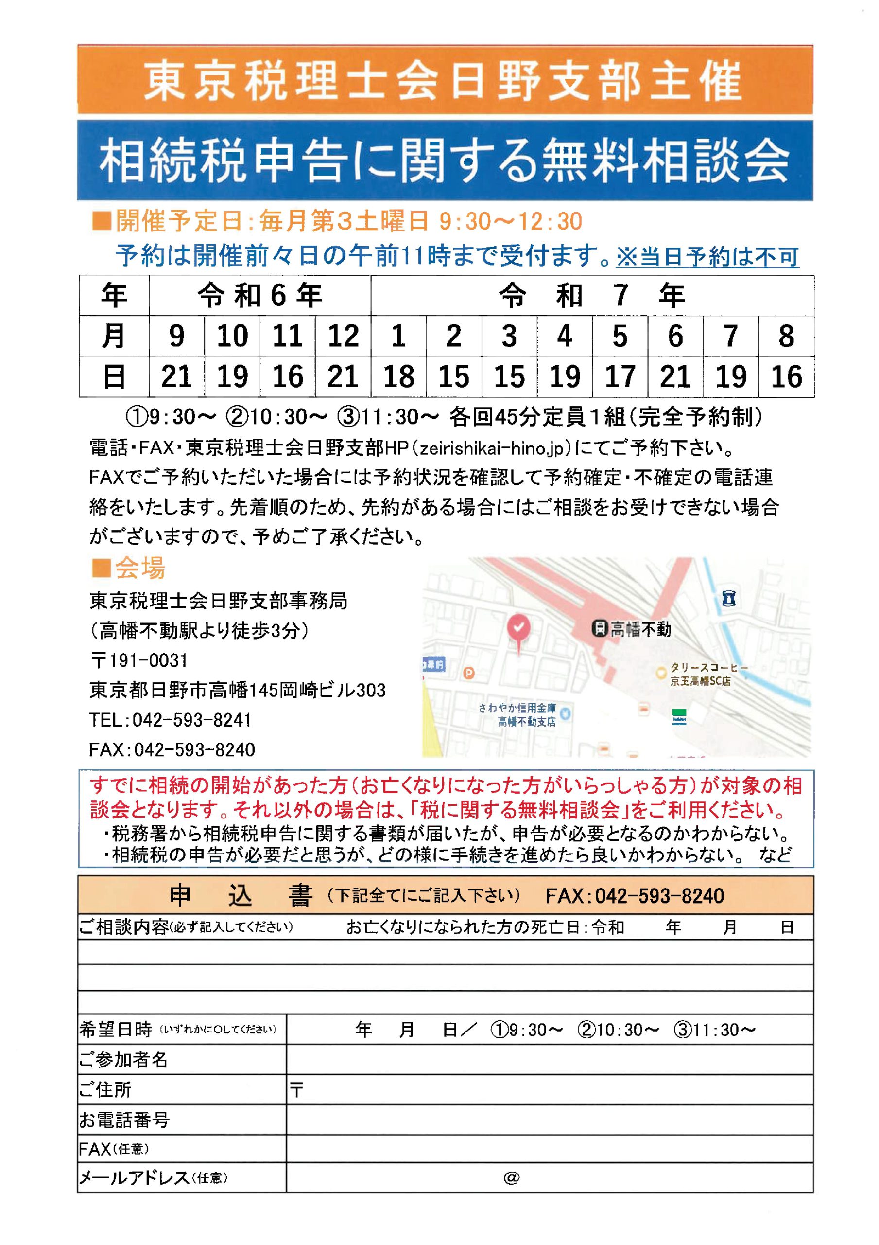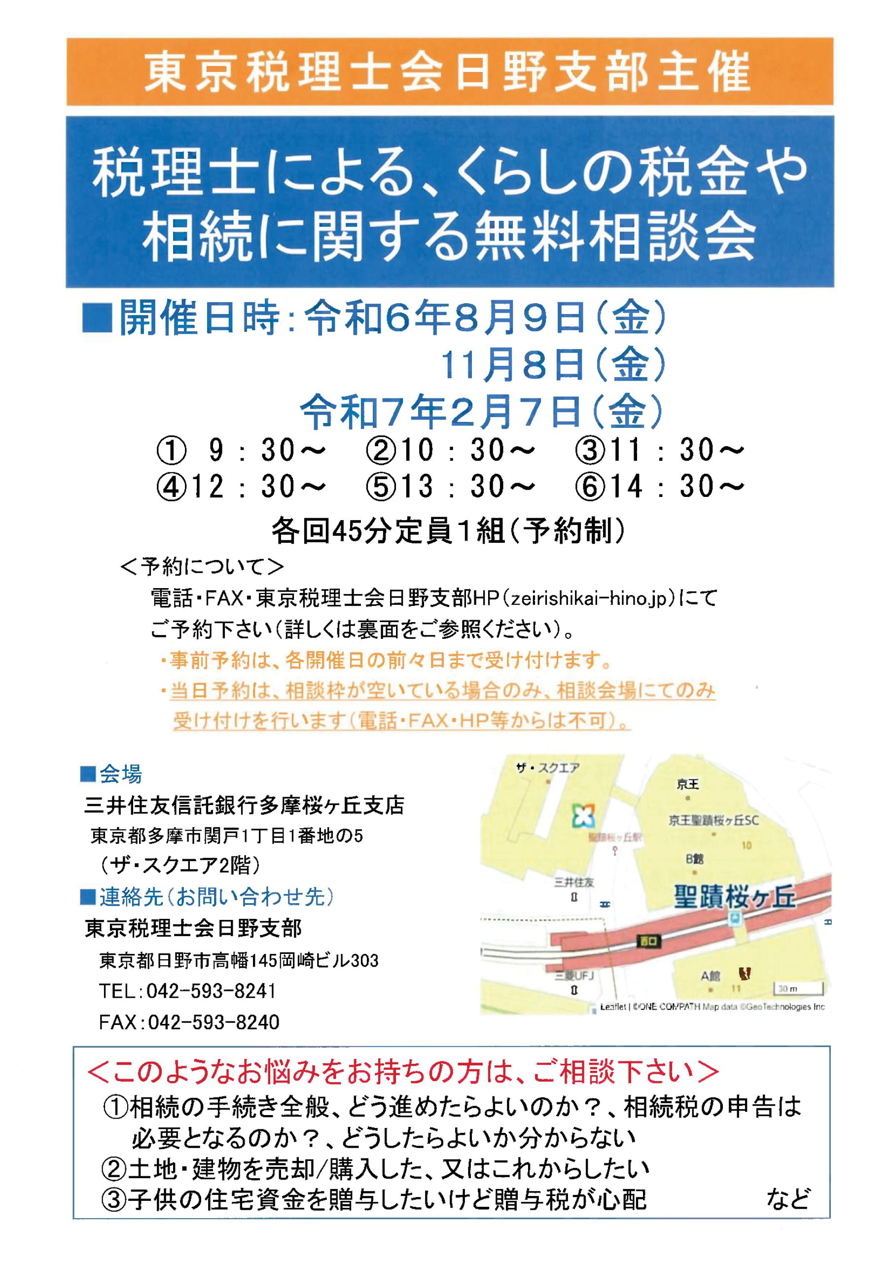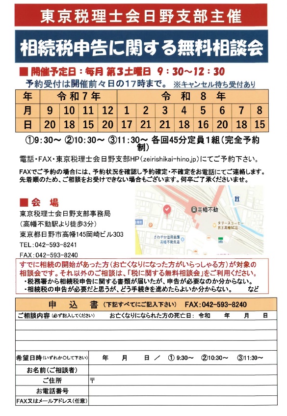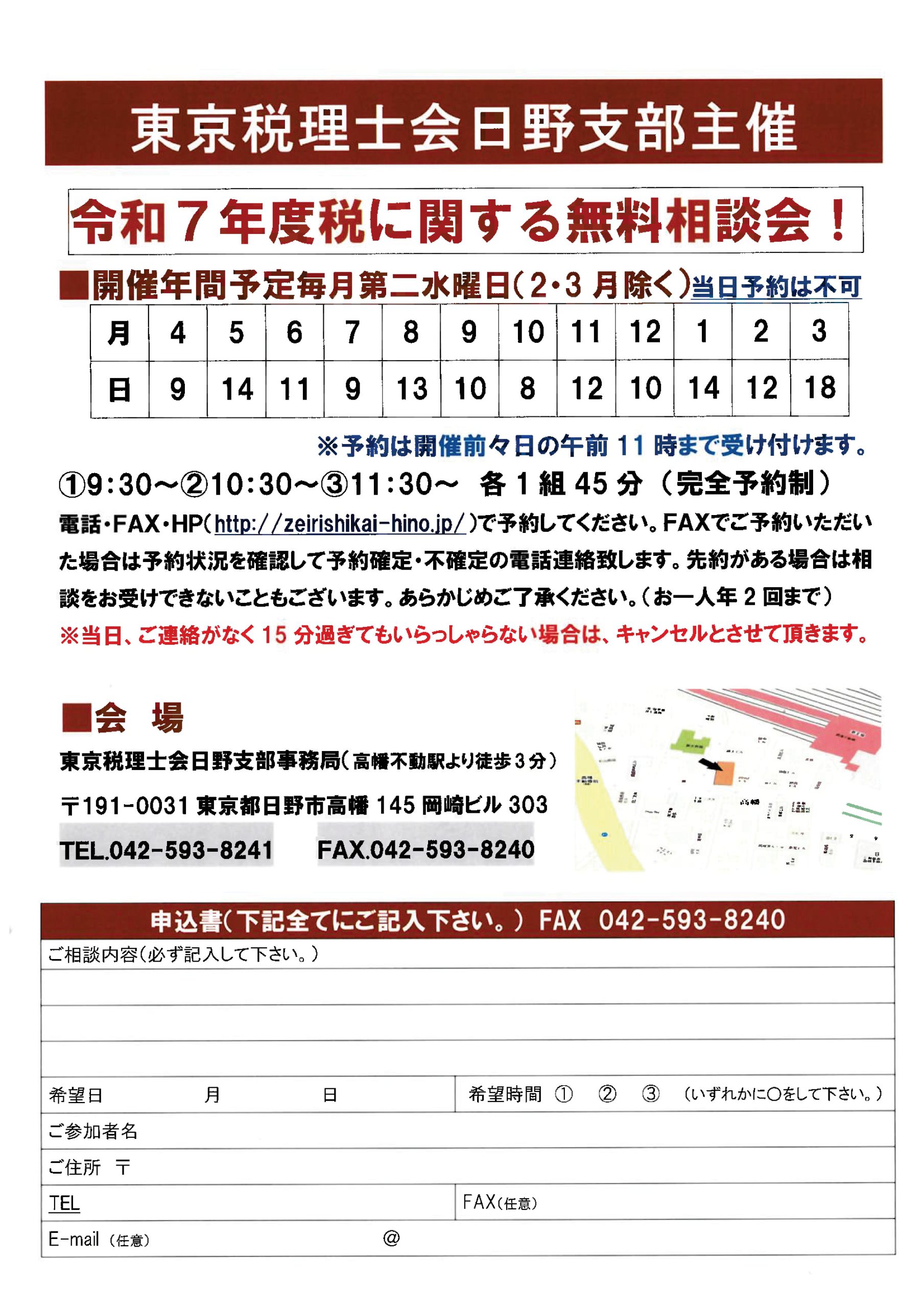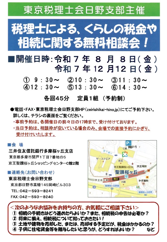 東法連ニュース 9.10月号 2025年9月18日2025年9月18日 東法連ニュース 7.8月号 2025年7月10日2025年7月10日 税理士会日野支部主催「相続税申告に関する無料相談会」 2025年7月8日 税理士会日野支部主催「相続に関する無料相談会」 2025年7月8日2025年7月8日 令和7年度税に関する無料相談会 東京税理士会日野支部主催 2025年2月26日2025年2月26日 成年後見制度に関する無料相談会 2024年7月10日 相続税申告に関する無料相談会 2024年7月10日2024年7月10日 税理士による、くらしの税金や相続に関する無料相談会 2024年7月10日2024年7月10日 LAFORETCLUB INFORMATION WINTER 2023年11月27日 2023.12-2014.2 幻想的な風景と極上の温泉 幻想の贅沢はそこに スポーツクラブメガロス優待チラシ 2023年7月1日2023年7月6日 野村不動産ライフ&スポーツ株式会社 生活習慣病予防検診のご案内 めぐみ会 2023年5月16日 ラフォーレ倶楽部 2023年度保存版 2023年3月1日2023年3月1日 がん検診(Bコース)のご案内 2023年1月31日 大和会 健康診断のご案内 スペシャルドックコース 2023年1月31日 行動する法人会 令和5年度税制改正に関する提言 2022年12月13日2022年12月23日 きらぼし銀行「脱炭素応援ローン」 2022年8月26日 健診のご案内 英世会クリニック 2022年8月17日 法人会 Audi Japan優待プログラムのご案内 2022年7月28日2022年7月28日 ネットが便利 申告・納税 e-Tax 2022年5月30日 令和3年度 税に関する絵はがきコンクール 日本政策金融公庫 ダイレクト 2022年3月23日2022年3月23日 日本政策金融公庫 中小小売商業活性化フォーラム 2022年1月18日2022年1月18日 東京都産業労働局 新型コロナウイルス 抗体検査 全日本労働福祉協会 2021年8月18日2021年8月18日 採血だけで検査できます 法人会貸倒補償制度 三井住友海上火災保険株式会社 2021年6月12日2021年6月17日 新型コロナウィルス感染症の影響を受ける法人会 会員の皆様へ(10/2現在) 政府系金融機関 支援機関等の施策のご案内 東京法人会連合会 2021年6月10日2021年6月22日 法人会会員限定 ビジネス情報誌 特別購読のご案内 東京法人会連合会 2021年6月9日2021年6月22日 「新型コロナウィルス 健康相談ダイヤル」緊急開設のご案内 大同生命保険株式会社 AIG損害保険株式会社 2021年6月3日2021年6月22日 ぽっと一息お届け隊 緊急!!新型コロナウィルス感染対策 『強酸性水お届け隊!』を結成 2021年5月29日2021年6月22日 脳ドックのご案内 医療法人社団 めぐみ会 田村クリニック 2021年5月28日2021年6月22日 田村クリニック検診室 移転のお知らせ 2020.1.7(火)から移転します 2021年5月27日2021年6月22日 漫画でわかる 法人会自主点検チェックシート 全国法人会総連合 2021年5月26日2021年6月22日 1 2 次へ →