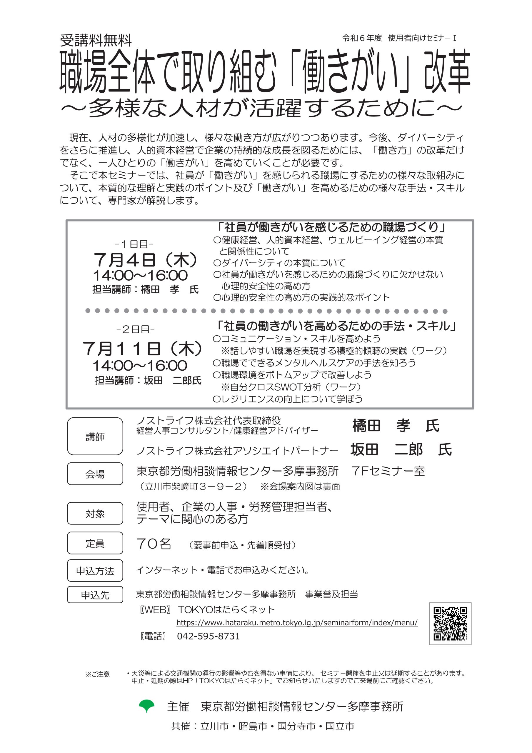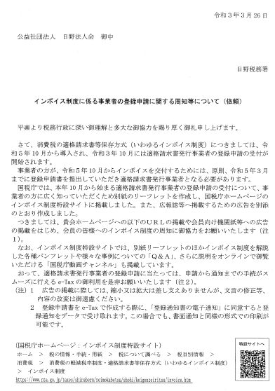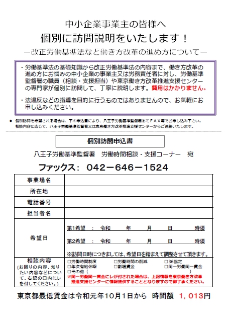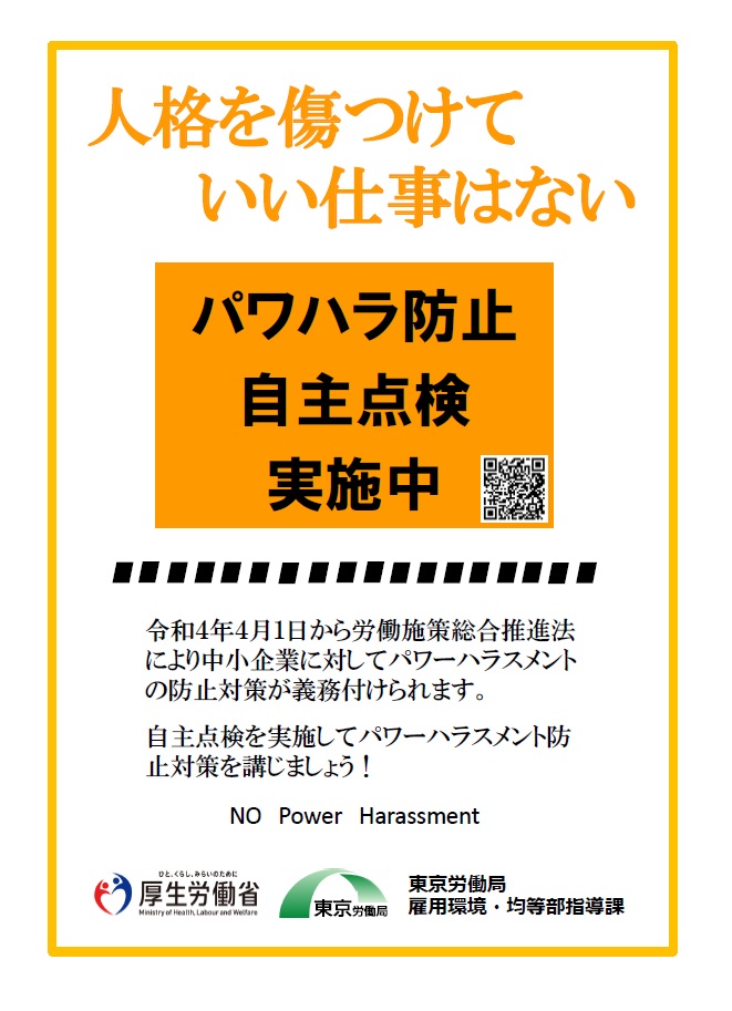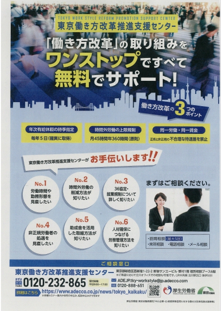 企業における介護離職防止対策 2024年5月30日 職場全体で取り組む「働きがい」改革 2024年5月30日 東京都最低賃金のお知らせ 2023年9月5日 東京労働局 業務改善助成金 2023年9月5日2023年9月5日 厚生労働省 パパ育業は、経営戦略だ。 2023年5月29日2023年5月29日 東京から始まる、みんなのパパ育業へ 令和5年4月1日からキャッシュレス納税の手続きが一部変わります! 2023年3月7日 東京都主税局 卒煙・禁煙のススメ 2023年2月14日2023年2月14日 東京都最低賃金 2022年9月7日2022年9月7日 東京労働局 八王子労働基準監督署移転のお知らせ 2022年9月2日 地球温暖化対策報告書 2022年7月13日2022年7月13日 多摩地域における雇用就業支援拠点を開設します 2022年6月27日 東京都労働相談情報センター八王子事務所の移転について 2022年6月27日 パワハラ防止自主点検実施中 2021年12月1日2022年1月17日 東京労働局 消費税 インボイス制度 令和3年10月1日から登録申請書受付開始! 2021年6月16日2021年6月17日 日野税務署からのお知らせ インボイス制度について 日野税務署 2021年6月15日2021年6月17日 チャットポッドによる 税務相談 国税庁 2021年6月11日2021年6月23日 東京都からのお知らせ 感染防止徹底宣言ステッカー 東京都 2021年6月10日2021年6月23日 働き方改革 厚生労働省 2021年6月7日2021年6月23日 次の世代に胸を張って託せる未来を!! 東京都環境局 2021年6月6日2021年6月23日 中小企業のための倒産防止のご案内 東京都産業労働局 2021年6月5日2021年6月23日 テレワーク業務から通常業務に戻る際のサイバーセキュリティに関する注意点 警視庁サイバーセキュリティ―本部 2021年6月4日2021年6月23日 中小企業事業主の皆様へ 個別に訪問説明を致します! 改正労働基準法など働き方改革の進め方について 八王子労働基準監督署 2021年6月3日2021年6月23日 Check!肝臓 従業員たちが危ないかも! 知ろう肝炎大切な従業員のために検査を取り入れましょう! 東京都福祉保健局 2021年6月2日2021年6月23日 2020年4月1日から屋内は原則禁煙です 東京都福祉保健局 2021年6月1日2021年6月23日