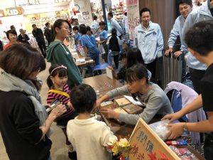 ![]() 青年部会が企画した「小学生起業家体験講座(ちびっこ商店街)」の商品販売の一場面 |