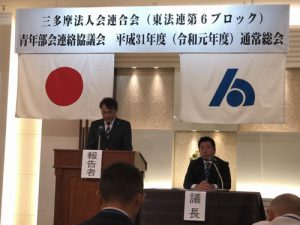 ![]() 三多摩法人会連合会 青年部会連絡協議会通常総会日野法人会青年部会の事業を報告する糟谷部会長 |