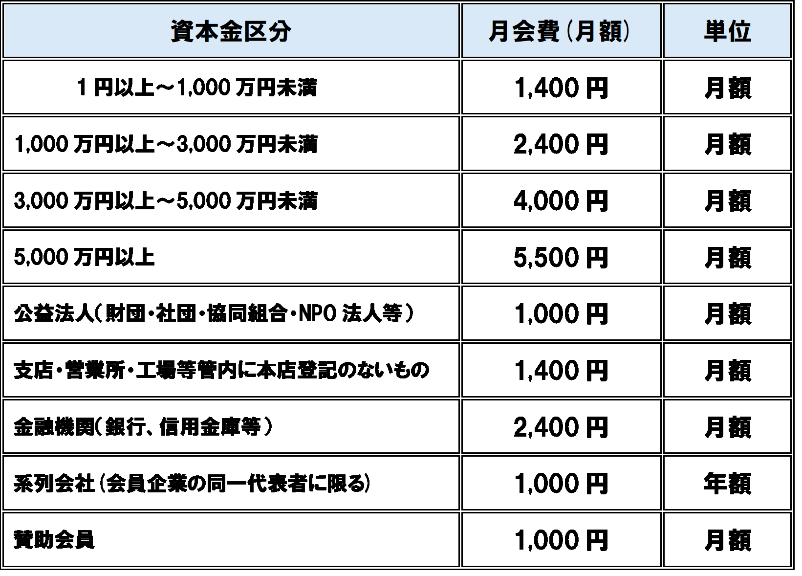 会社の資本金によって下記の通り決められており、全額会社の損金となります。(入会金はありません)