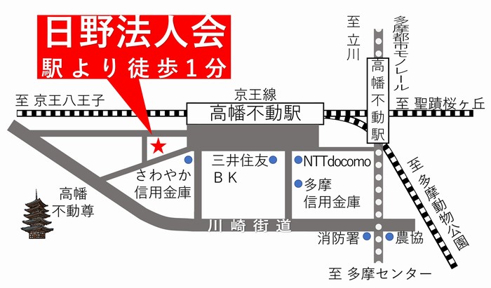 アクセス 〒191-0031 東京都日野市高幡3-8田中ビル2階【法人番号:8013405000886】電話 042-593-9900 FAX 042-593-9899 ↑Google地図で拡大縮小して見る場合はこちらへ