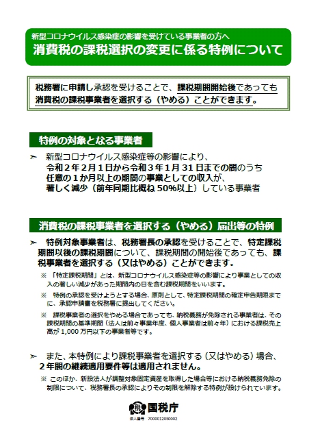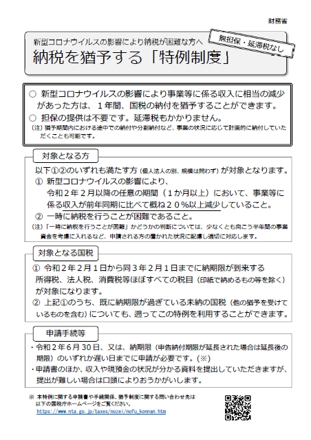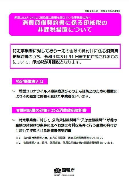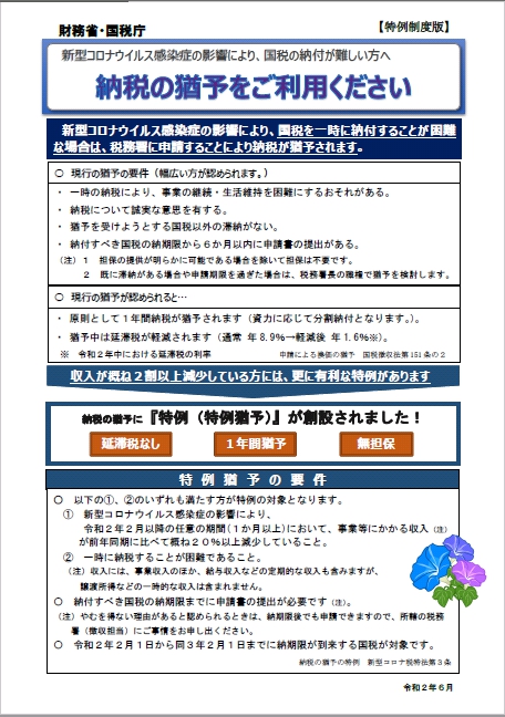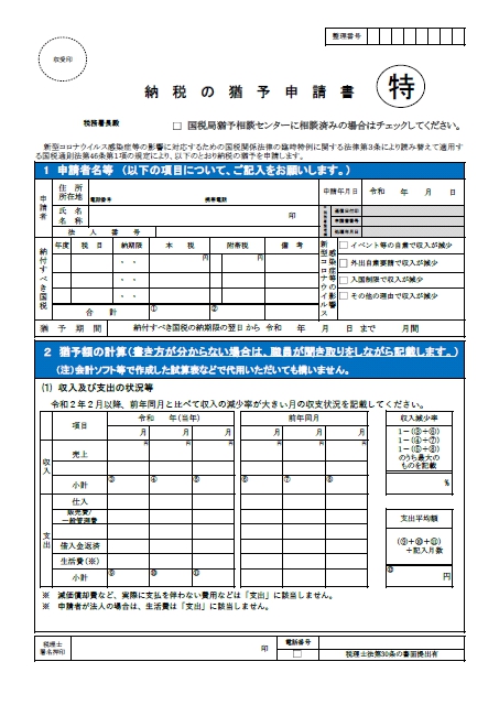 納税の猶予をご利用ください 2021年6月21日2021年6月21日 欠損金の繰戻し還付制度を利用できる法人の範囲が拡大されました 2021年6月21日2021年6月21日 テレワーク等のための設備投資が中小企業経営強化税制の対象になりました 2021年6月21日2021年6月21日 消費税の課税選択の変更にか係る特例について 2021年6月21日2021年6月21日 消費貸借契約書に係る印紙税の非課税措置について 2021年6月21日2021年6月21日 納税を猶予する「特例制度」 2021年6月21日2021年6月21日 納税の猶予申請書 2021年6月21日2021年6月21日