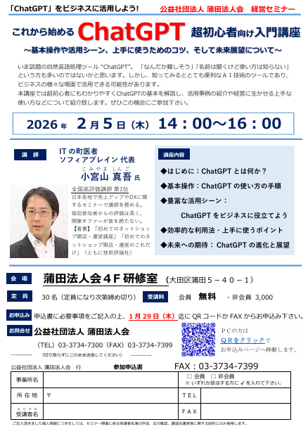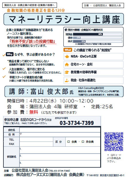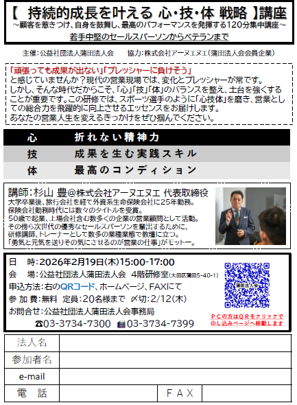 会員の皆様へ!メールアドレスの登録をお願い致します。蒲田法人会では、会員の皆様へのサービスの充実を図っていくため、今後はITを活用した会運営を行って参ります。メールアドレスを登録して頂くことで、タイムリーな情報をお届けすると同時に、行事予定のご案内から受信メールからの参加回答などをスマホからでも可能となります。 是非登録して活用してください!登録はこちら