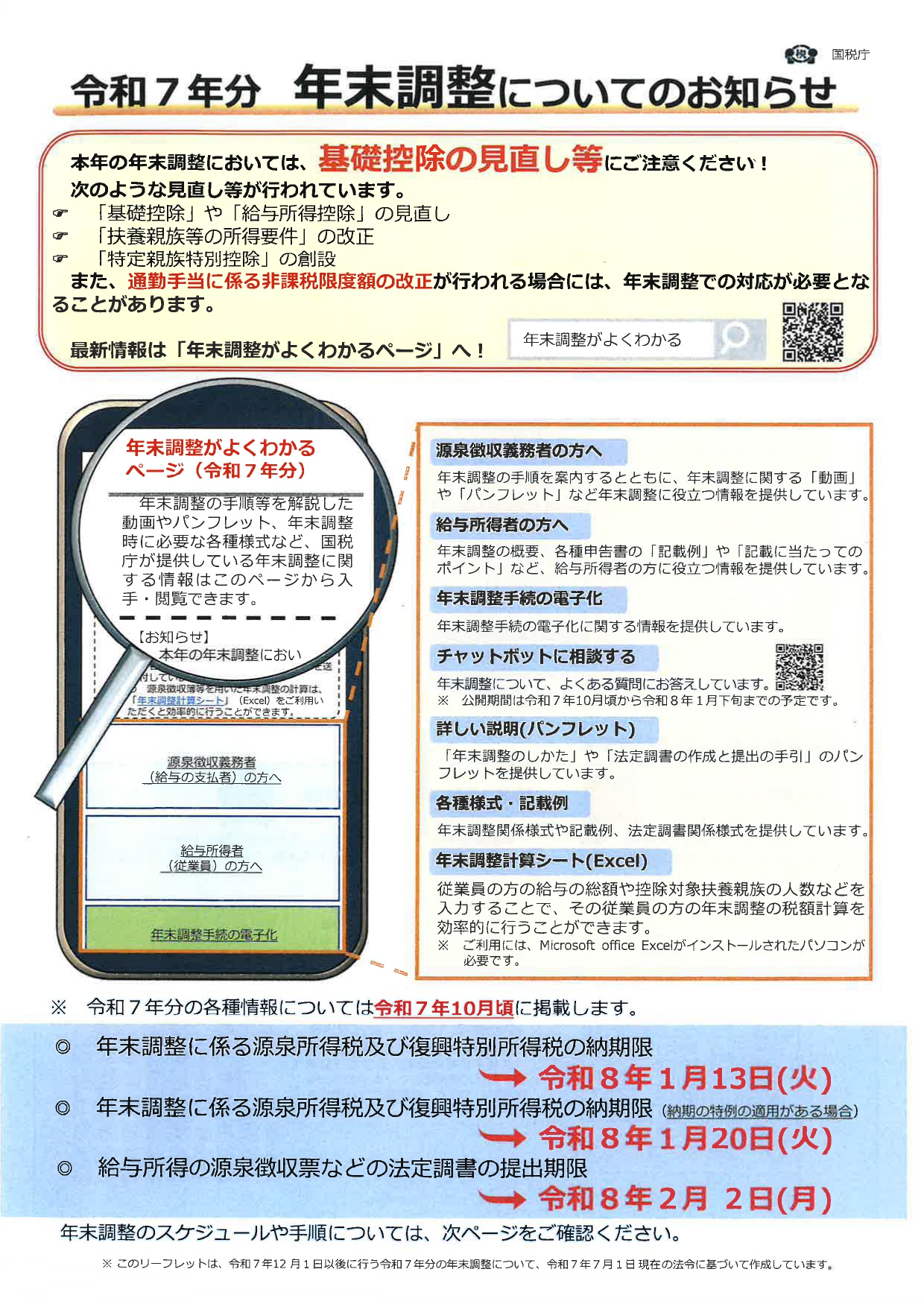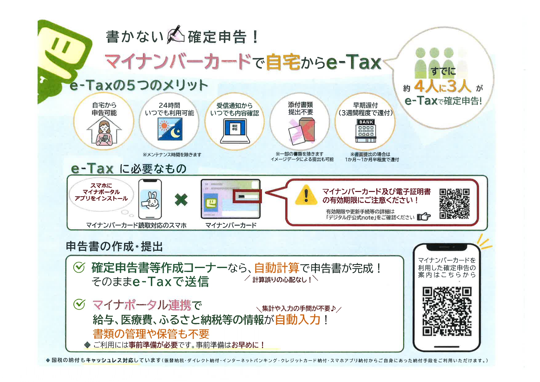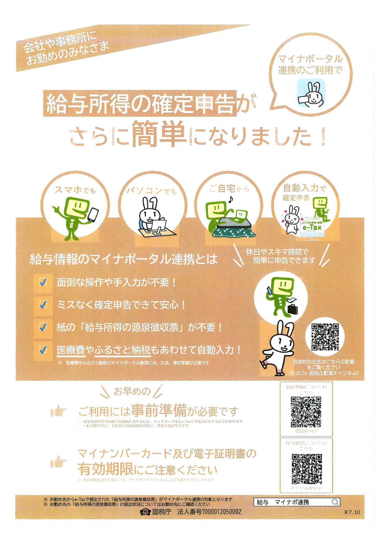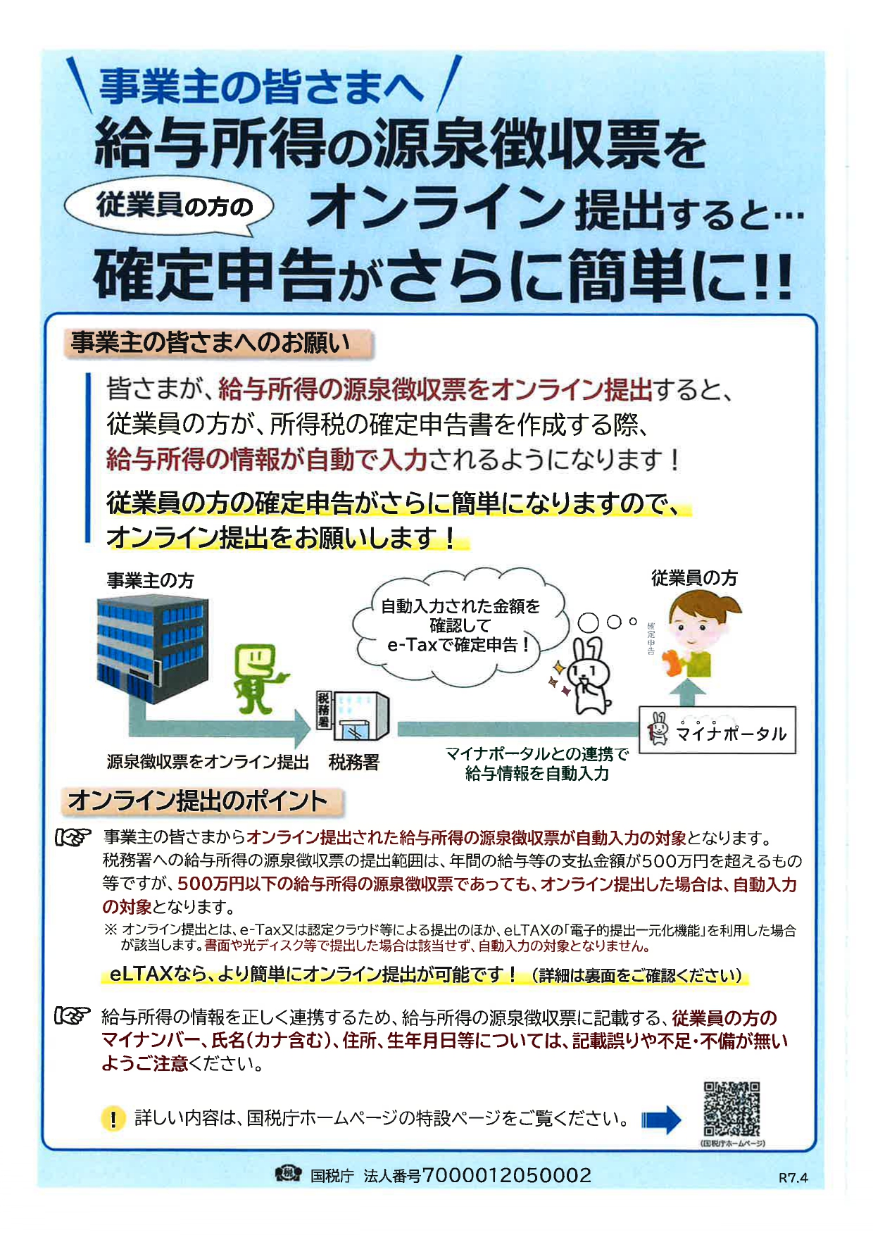 令和7年分 年末調整についてのお知らせ 2025年11月21日 事業主の皆様へ 給与所得の源泉徴収票をオンライン提出すると従業員の方の確定申告がさらに簡単に!! 2025年11月20日 書かない確定申告!マイナンバーカードで自宅からe-Tax 2025年11月20日 給与所得の確定申告がさらに簡単になりました! 2025年11月20日 国税職員採用募集 2025年2月19日2025年2月19日 確定申告は マイナポータル連携で自動入力 2025年2月10日 書かない 確定申告 マイナンバーカードでe-Tax 2025年2月10日2025年2月19日 ご存じですか? 文書回答手続 2024年12月23日 事業主の皆さまへ 給与所得の源泉徴収票をe-Taxで提出すると…従業員の方の確定申告がさらに簡単に!! 2024年12月9日 e-Taxソフト(WEB版)のご利用方法 2024年12月9日 事業者のデジタル化促進に関するリーフレット・動画一覧 2024年12月9日 令和6年度確定申告期における開庁日対応について 2024年12月9日 書かない 確定申告! 確定申告はマイナンバーカードでe―Tax 2024年12月9日 確定申告がさらに便利 給与の源泉徴収票の情報がマイナポータル連携で自動入力されます! 2024年12月9日 確定申告はマイナンバーカードを利用したe-Taxをご利用ください! 2024年12月9日 令和7年1月からの申告書等の控えへの収受日付印の押なつについて 2024年12月9日 申告・納税と一緒に 日々の業務もデジタル化しませんか? 2024年11月7日 申告・納税はē-Tax で手続きを! 2024年11月7日 東京国税局は事業者のデジタル化を応援します! 2024年9月26日 令和6年度分所得税の定額減税Q&A 2024年4月22日 インボイス制度への対応に取り組む皆様へ 各種支援策のご案内 2024年2月28日 インボイス制度 多く寄せられるご質問 2024年2月28日 マンガでわかる インボイス記載事項 2024年2月28日 インボイス記載事項チェックシート 2024年2月28日 令和5年分 所得税・贈与税・消費税(個人)の確定申告について 2024年2月6日2024年2月6日 令和6年能登半島地震に係る国税の申告・納付等の期限の延長について 2024年1月11日 使ってみると便利です! キャッシュレス納付! 2023年12月1日 公正取引委員会 インボイス制度の実施に向けた公正取引委員会の取組 2023年9月15日2024年2月6日 東京国税局 資料4 令和5年度税制改正等による激変緩和・負担軽減策の概要 2023年9月15日2023年10月2日 東京国税局 資料3 各種相談体制・支援策の概要 2023年9月15日2023年10月2日 東京国税局 資料2 事業者支援策全体の概要 2023年9月15日2023年10月2日 東京国税局 資料1 インボイス制度の開始に向けて特にご留意いただきたい事項等 2023年9月15日2023年10月2日 プレプリント納付書の送付対象者の見直しについて 2023年9月12日2023年10月2日 とうきょうの労働 2023.6 2023年7月3日2023年9月12日 源泉所得税の改正のあらまし 2023年6月22日 国税に関するご質問・ご相談は国税庁ホームページで解決! 2023年5月22日 マイポータル連携で確定申告書に自動入力! 2023年4月7日 申請者が納税情報を自動で添付できる仕組みを運用開始! 2023年4月7日 電子納税証明書(PDF)がさらに便利に!スマホで請求!スマホで受取! 2023年4月7日 紙で申告した方もe-Taxで所得税申告書等のPDFファイル取得を出来ます! 2023年4月7日 申告書等提出事実等の確認手段 2023年4月7日 インボイス制度、支援措置があるって本当 2023年2月27日 インボイス制度の負担軽減措置(案)よくあるの質問とその回答 2023年2月21日 自動計算・自動入力・自宅から 確定申告はスマホからがおすすめです! 2023年1月30日 さあ 自宅でのe-Tax! 確定申告書等作成コーナーから! 2023年1月30日 マイナポータル連携で確定申告書に自動入力! 2023年1月30日 あなたの確定申告をサポートします 2023年1月30日 令和4年度確定申告 2023年1月26日 インボイス制度への事前準備の基本項目チェックリストシート 2022年12月9日 申告漏れがあった場合には売上げに関する帳簿を作成・保存していない事業者 の方は加算税が重くなります 2022年12月6日 キャッシュレスで国税の納付ができます 2022年11月25日 今年こそ年末調整を電子化しましょう! 2022年11月25日 マイナポータル連携で確定申告書に自動入力 2022年11月25日 さあ自宅でe-Tax!確定申告書策定コーナーから 2022年11月25日 令和4年度決算法人説明会動画及び電帳法対応動画配信チラシ 2022年11月25日 「文書回答手続」がe-Taxで利用できるようになりました!! 2022年10月27日 個人事業者の皆様へ 消費税インボイス制度をご存知ですか? 2022年10月4日 消費税 インボイス制度は免税事業者も関係します 2022年10月4日 消費税 インボイス制度開始に向けた準備はお済ですか 2022年10月4日 法人事業者の皆様へ「新たな動画(インボイス制度関係)」作成 2022年10月4日 消費税の仕入税額控除の方式として インボイス制度が開始されます。 2022年9月21日 第53回財政経済セミナー(租税教育に携わる方を対象に) 2022年7月1日 源泉所得税の改正のあらまし 令和4年4月 2022年6月16日 法人番号の利活用 2022年5月19日 消費税 知っていますか? インボイス制度 2022年4月15日 消費税 インボイス制度が始まります! 2022年4月5日 はじめませんか、書類のスキャナ保存!