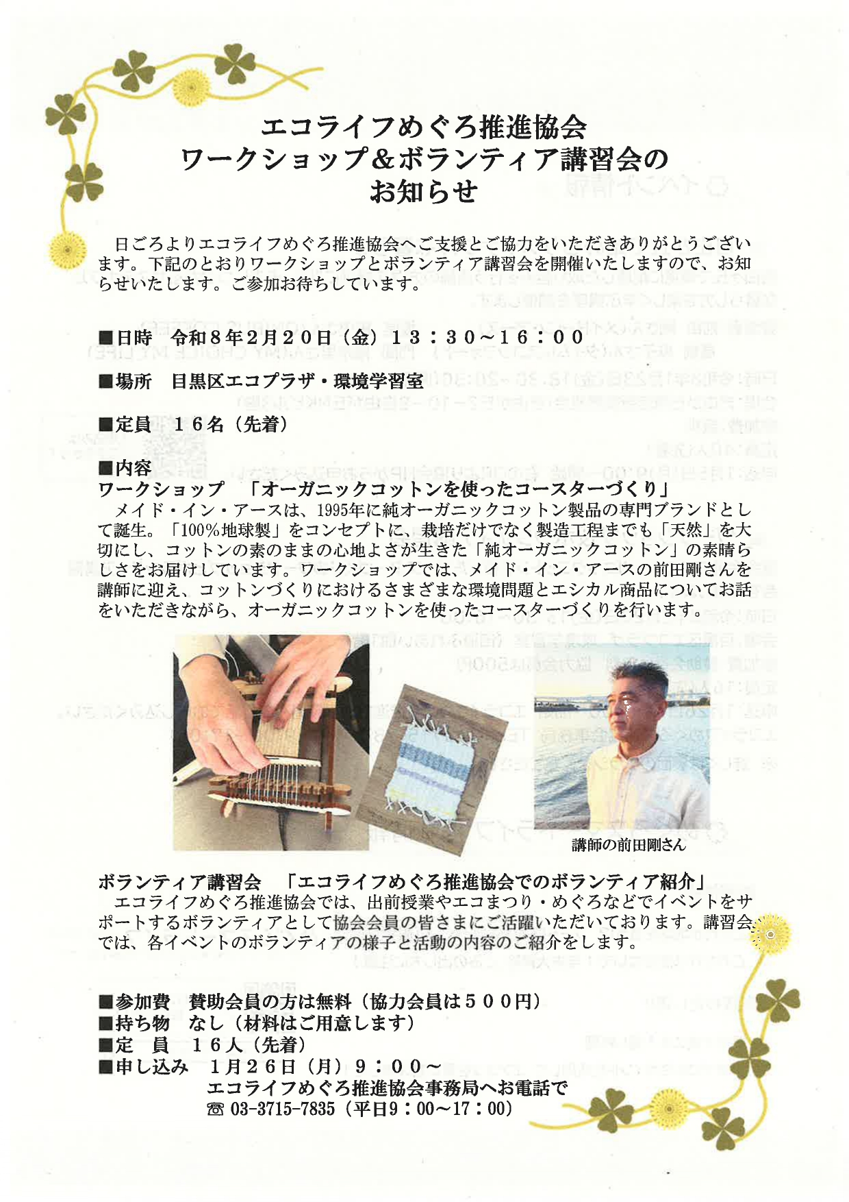 エコライフめぐろ推進協会 ワークショップ&ボランティア講習会のお知らせ