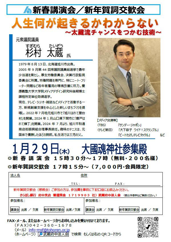 新春講演会・賀詞交歓会 講演会はどなたでもご参加いただけます 開催日時:2026年1月29日(木) _____新春講演会 15:30~17:00(無料、200名様) _____賀詞交歓会 17:15~(会員限定、7,000円) 開催場所:大國魂神社参集殿 お申込みはこちらから