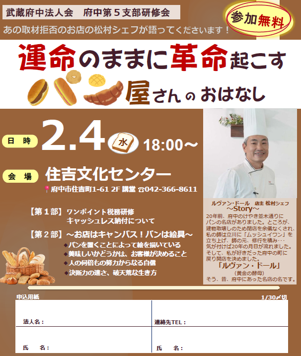 【府中第5支部研修会】 どなたでもご参加いただけます 開催日時:2026年2月4日(水) 18:00~ 開催場所:住吉文化センター (府中市住吉町1-61-61) 内 容:第一部 ワンポイント税務研修 (武蔵府中税務署 担当官) _____第二部 運命のままに革命起こすパン屋さんのおはなし (ルヴァン・ドール 松村氏) お申込みはこちらから