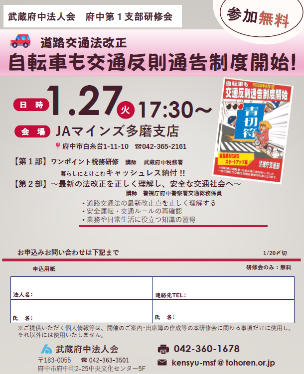 【狛江第1支部研修会】どなたでもご参加いただけます 開催日時:2025年1月27日(火) 17:30~ 開催場所:JAマインズ多摩支店(府中市白糸台1-11-1) 内 容:第1部 ワンポイント税務研修(武蔵府中税務署 担当官) _____第2部 道路交通法改正(警視庁府中警察署 交通総務係員) お申込みはこちらから