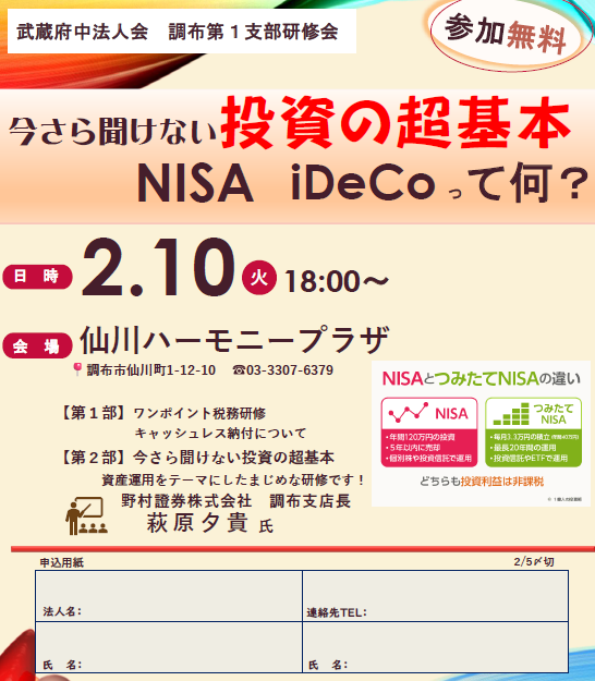 【調布第1支部研修会】 どなたでもご参加いただけます 開催日時:2026年2月10日(火) 18:00~ 開催場所:ハーモニープラザ仙川 (調布市仙川町1-6-10) 内 容:第一部 ワンポイント税務研修 (武蔵府中税務署 担当官) _____第二部 今さら聞けない投資の超基本 (野村證券株式会社調布支店長 萩原氏) お申込みはこちらから