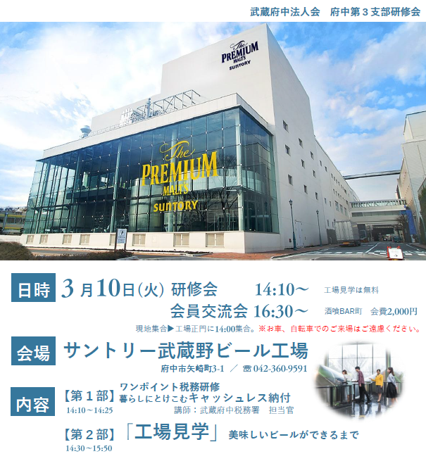 【府中第3支部研修会】 どなたでもご参加いただけます 開催日時:2026年3月10日(火) 14:10~ 開催場所:サントリー武蔵野ビール工場 (府中市矢崎町3-1) 内 容:第一部 ワンポイント税務研修 (武蔵府中税務署 担当官) _____第二部 サントリー武蔵野ビール工場見学