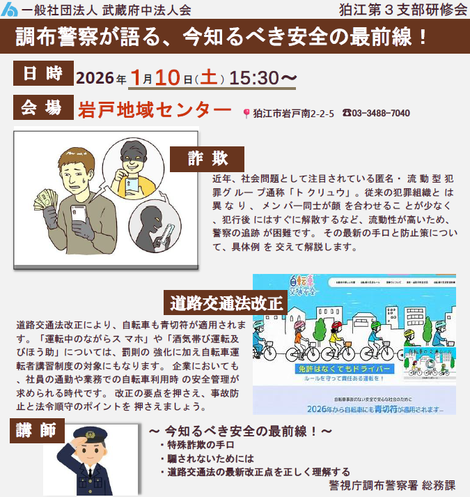 【狛江第3支部研修会】 どなたでもご参加いただけます 開催日時:2026年1月10日(土) 15:30~ 開催場所:岩戸地域センター (狛江市岩戸南2-2-5) 内 容:調布警察が語る、今知るべき安全の最前線! _____(講師:警視庁調布警察署 担当官) FAX(042-360-1678)またはメールにてお申し込みください。