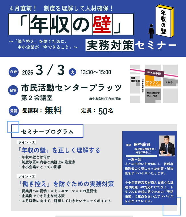 4月直前!制度を理解して人材確保! 「年収の壁」実務対策セミナー 実施日:2026年3月3日(火) 場 所:市民活動センタープラッツ 第2会議室(府中市宮町1-100) _参加費:無料 定 員:50名 🌟お申し込みはこちら