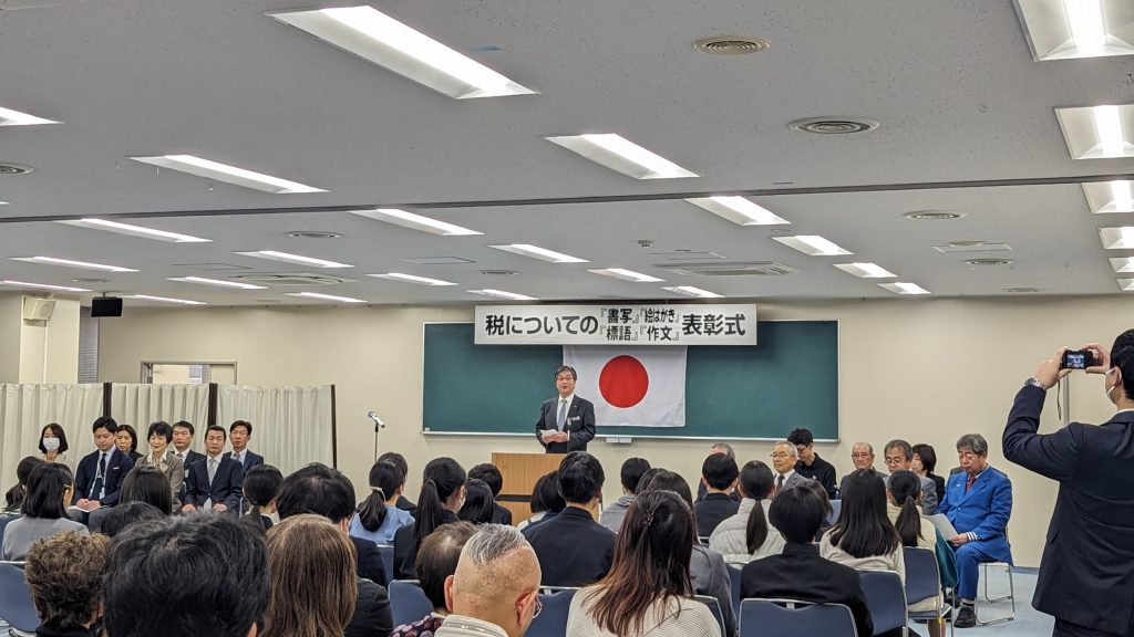 令和6年12月4日、 渋谷税務署7階 大会議室において 税についての「絵はがき」「書写」「標語」「作文」合同表彰式が行われました