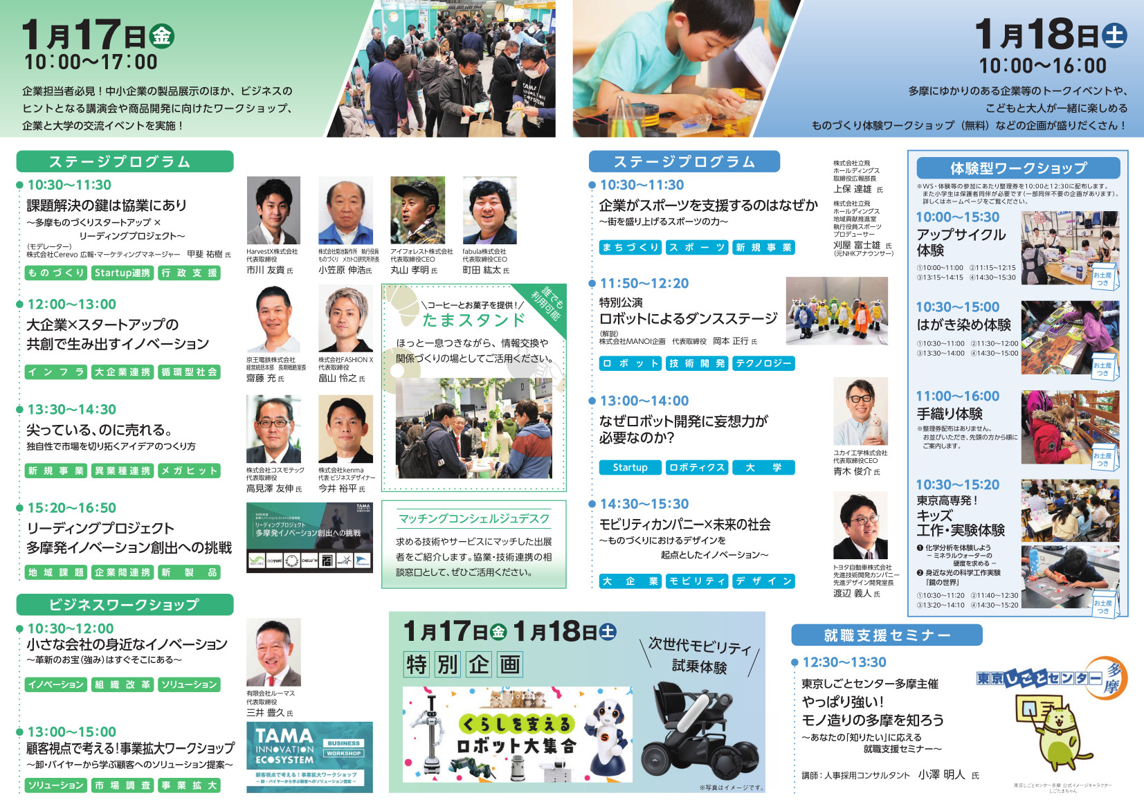 2日間にわたり、ビジネスのヒントとなる魅力的なステージイベントや、お子様から大人まで楽しめるものづくり体験などのワークショップ、次世代型モビリティ試乗体験などの特別企画も実施いたします。
