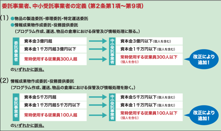 中小企業の場合、一般的には違反される側であり、それほど気にされていないかもしれませんが、違反する側になるケースもあるので気をつけてください。特に資本金1,000万円超の事業者が、資本金1,000万円以下の法人や個人事業者へ委託する場合には、該当するケースが多いのではないでしょうか。