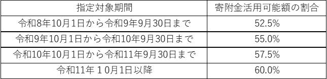 寄付を受ける自治体側は、寄付の合計額から費用を控除して、60%以上を寄付の目的に使う必要があります。別な言い方をすると、返礼品や業者への支払いの合計を40%未満としなければならないことになります。この改正については、経過措置を設け段階的にコスト額が圧縮されていきます。具体的には下記のとおりで、60%以上となるのは令和11年10月以降の寄付からとなります。