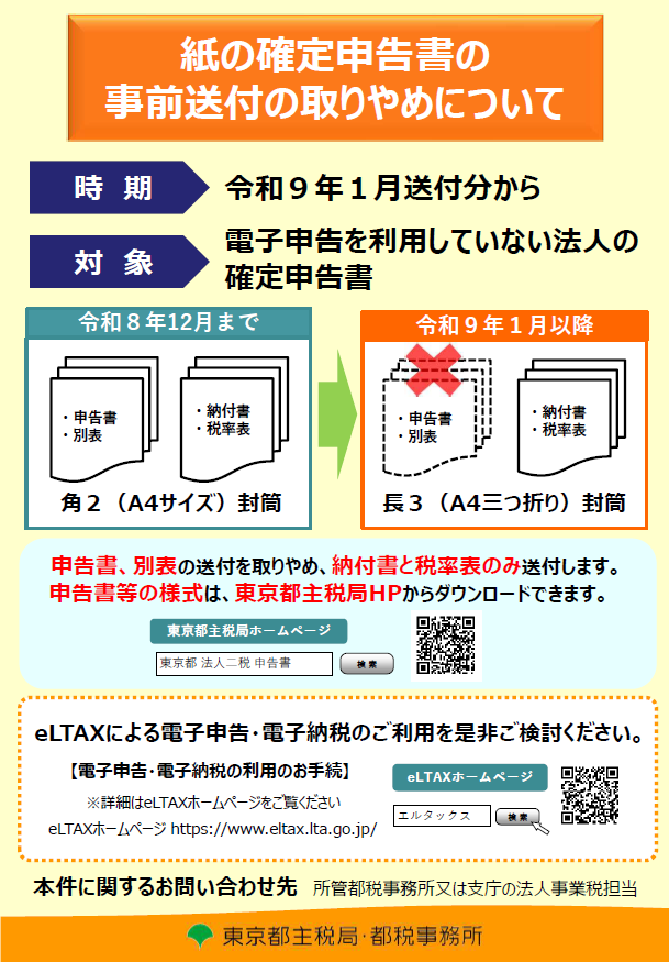 東京都主税局からのお知らせ!電子申告未利用法人への紙の確定申告書の事前送付取りやめについて